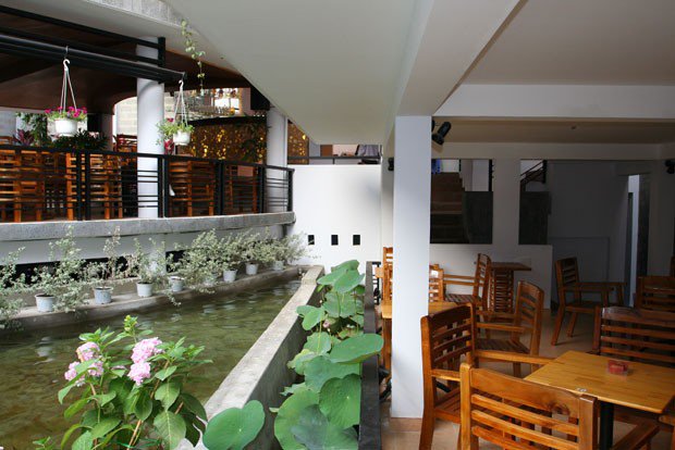 Bước chân vào quán, đập vào mắt bạn là vách nước với những chú cá nhân tạo như đang lội ngược dòng nước siết. Toàn bộ không gian quán được bao quanh bởi mặt nước và ẩn bên dưới là những viên đá to đồ sộ, với cách thiết kế khéo léo và tinh tế của chủ quán khiến bạn có cảm giác như đang ngao du trên con thuyền lênh đênh giữa biển khơi hòa cũng những bản nhạc tình ca êm đềm, sâu lắng.