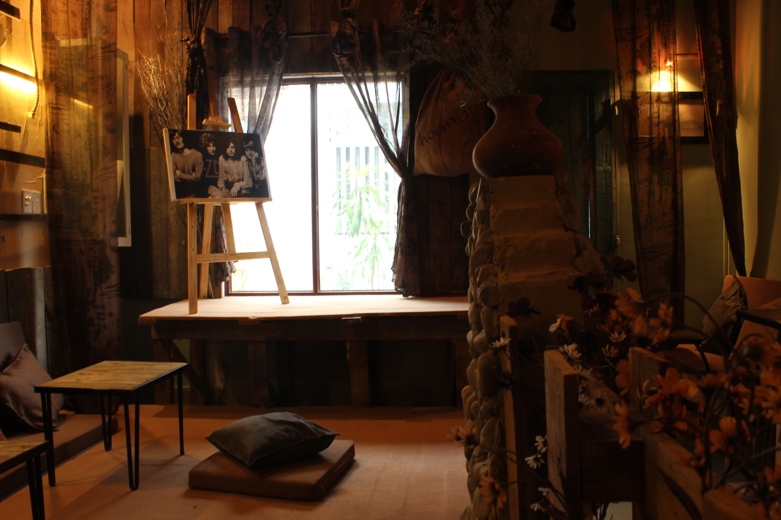 Những vật dụng từ những căn nhà bỏ hoang đã được chủ quán mang về và tận dụng như khung cửa, gỗ ốp tường, lò sưởi, đàn guitar, điện thoại, dây thừng, bao bố… “Khi tìm những vật dụng này thì mình lại phát hiện ra rất nhiều câu chuyện bí ẩn, ly kì, lẫn lãng mạn xoay quanh nó.” - Anh chàng chủ quán cười tươi bật mí.