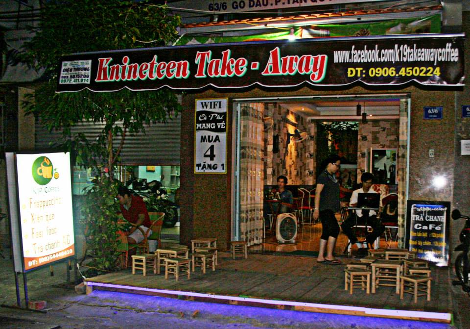 Địa chỉ: 63/6 Gò Dầu, P.Tân Quý, Q.Tân Phú, Tp.HCMĐiện thoại: 08 5444 6410Facebook: https://www.facebook.com/K19TakeAwayCoffee “Enjoy your time being here”, với phương châm này, thì K19 là một nơi mà khi đến, cảm giác đầu tiên mà bạn có sẽ là “ồ, nơi này thật thân thiện và ấm áp”! Khách hàng đến với k19 sẽ cảm nhận được sự đầu tư về không gian, đó là điều khác biệt với đa số các quán take away khác trong thị trường hiện nay.