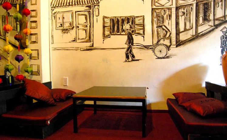 Nằm khuất trong một con hẻm yên tĩnh trên đường Nguyễn Trãi, bước vào N.A.T Café, bạn như lạc vào phố cổ Hội An thân thương với không gian đặc sánh gam màu nâu trầm của đất, nhẹ nhàng và bình yên đến lạ. Bốn bức tường của N.A.T là bức tranh cuộc sống phố cổ sống động được trang trí bằng những nét vẽ tinh tế và tỉ mỉ, cẩn thận đến từng chi tiết, từ mũi thuyền sông quê, mái hiên phố Hoài đến người chèo đò cần mẫn, thấp thoáng dáng người nhỏ bé tản bộ trên đường… Những họa tiết đó càng thêm đậm nét thi vị khi kết hợp với ánh đèn vàng và ánh sáng căng phồng trong chiếc đèn lồng.