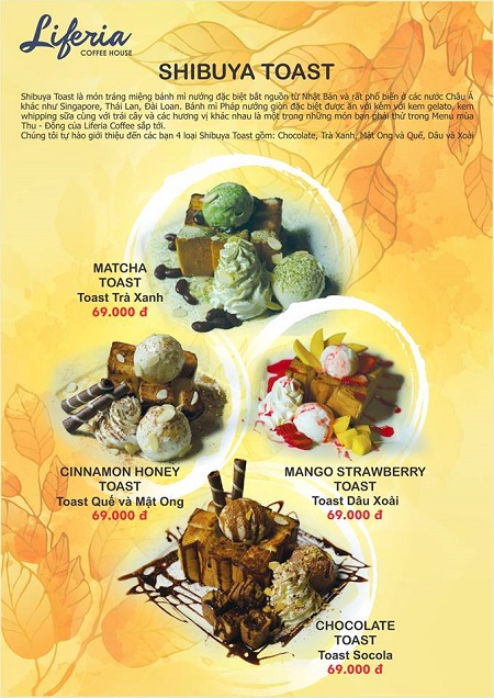 Shibuya Toast là món tráng miệng bánh mì nướng đặc biệt bắt nguồn từ Nhật Bản và rất phổ biến ở các nước Châu Á khác như Singapore, Thái lan và Đài Loan. Bánh mì Pháp nướng giòn đặc biệt được ăn kèm với kem gelato, kem whipping sữa, cùng trái cây và các hương vị khác nhau là một trong những món bạn nên thử trong Menu mùa này của Liferia Coffee.
